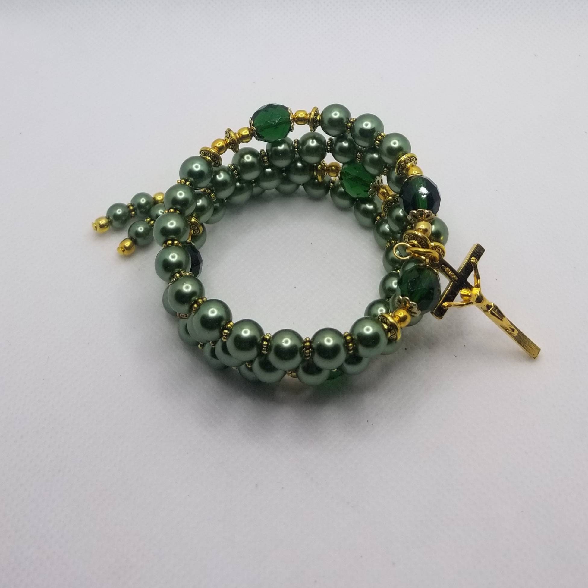 The decade beads are 8mm deep forest green glass pearls.