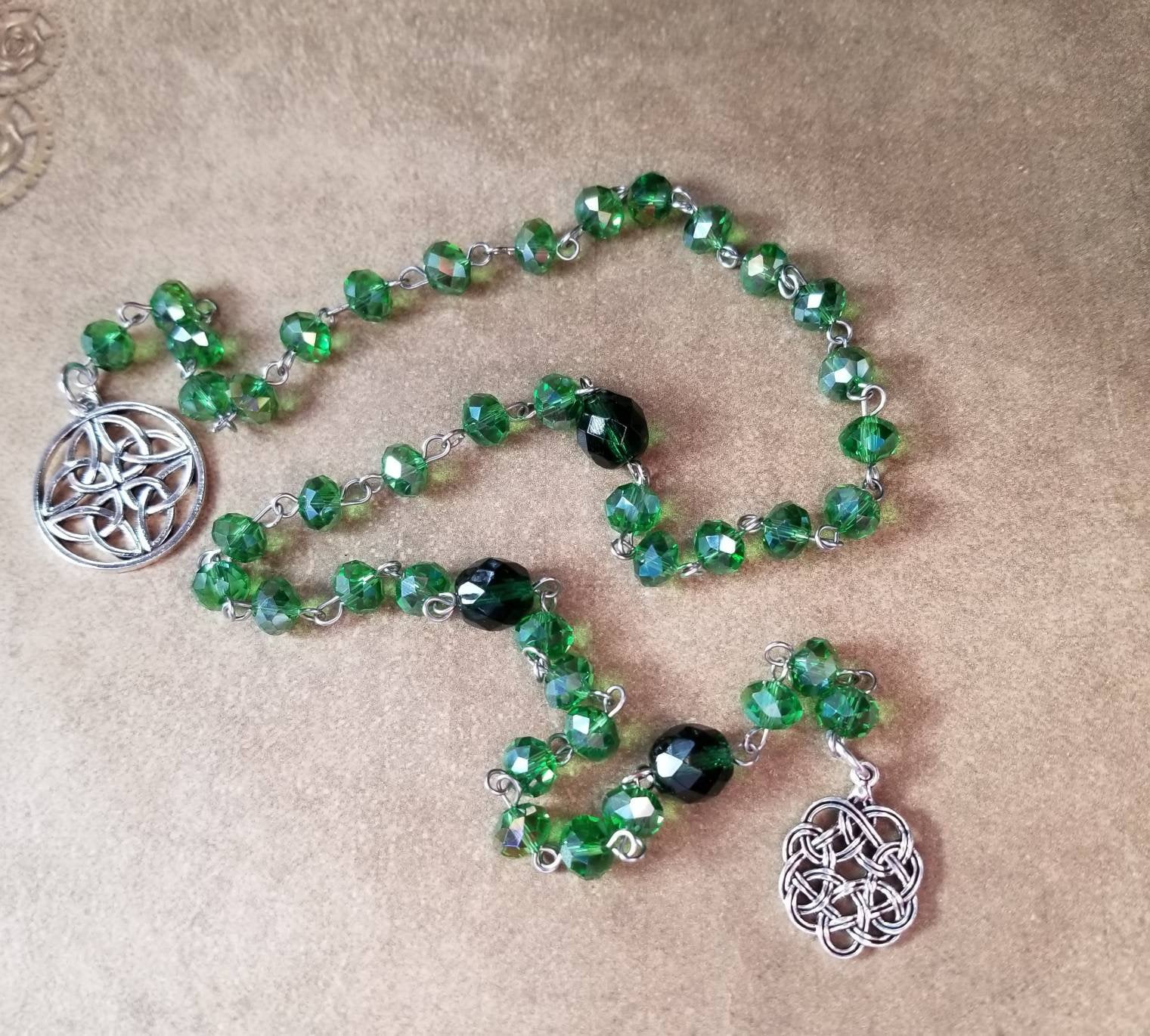 This gorgeous green Witches ladder is hand-wired using stainless steel eye pins and features faceted Czech glass beads and two silver-toned metal Celtic knotwork charms.