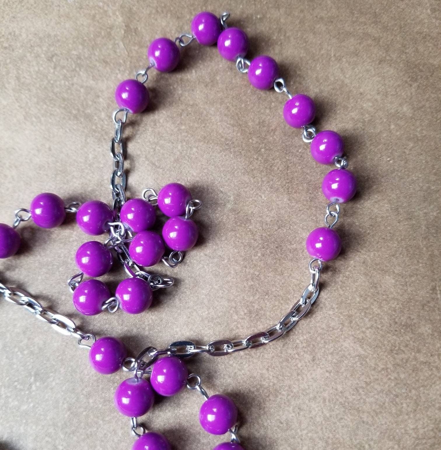This beautiful purple Witches ladder is hand-wired using stainless steel eye pins and features colorful beads, a gemstone pendulum point, and a silver-toned metal charm.