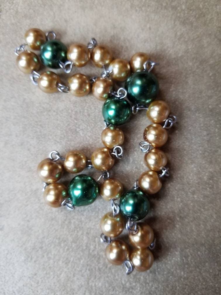 It has 10mm green glass pearls for the larger beads and a 12mm green glass pearl for the head bead.